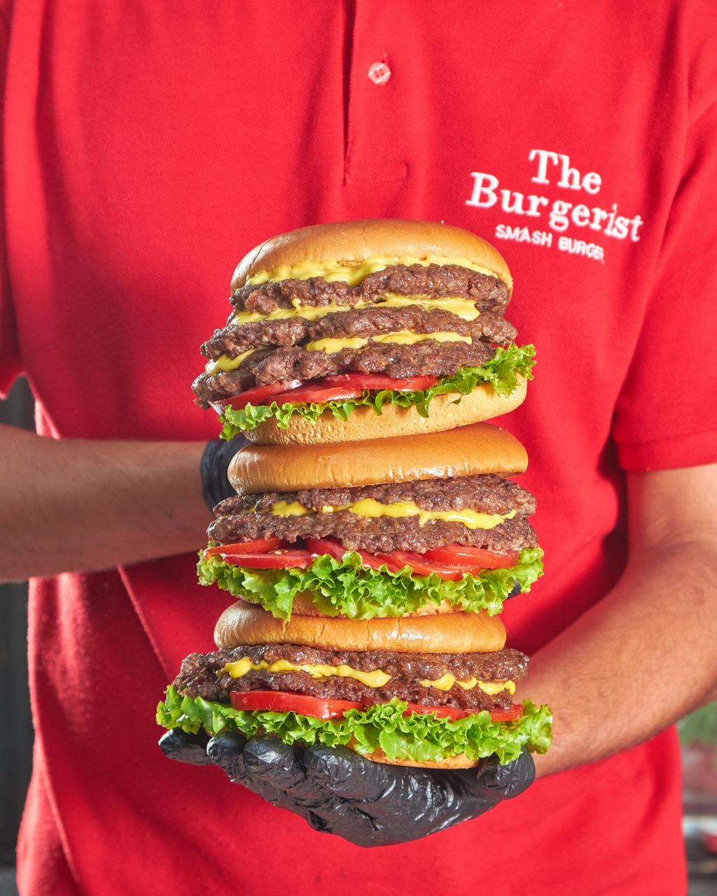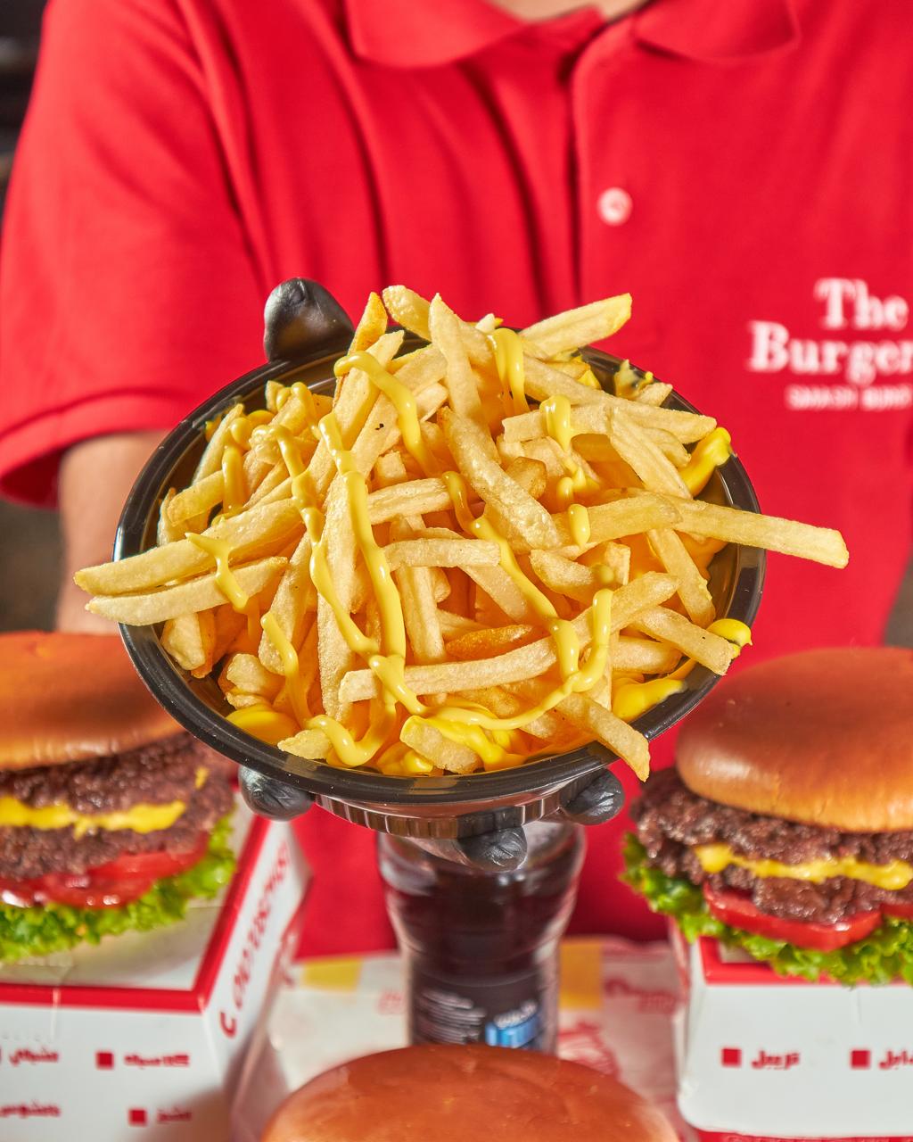 Berioche bun - 3 pieces of smash burger - cheddar sauce - tasty sauce - carmalized onion - tomato - lettuce - French fries
